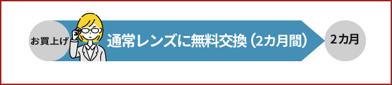 遠近両用レンズをお買い上げしたものの、見え方に慣れない方について、お買い上げ日から2カ月の間に1回限り、通常のレンズに無料交換致します。